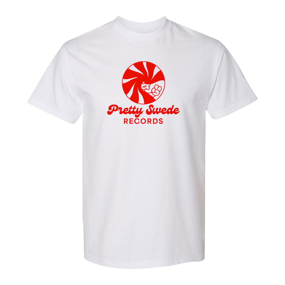White 100% cotton tee with a red Pretty Swede Records logo front print