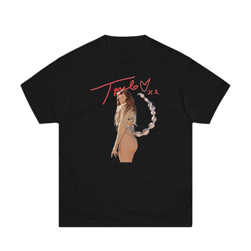 Black cotton tee with Tove Lo in her Scorpion Suit front print.