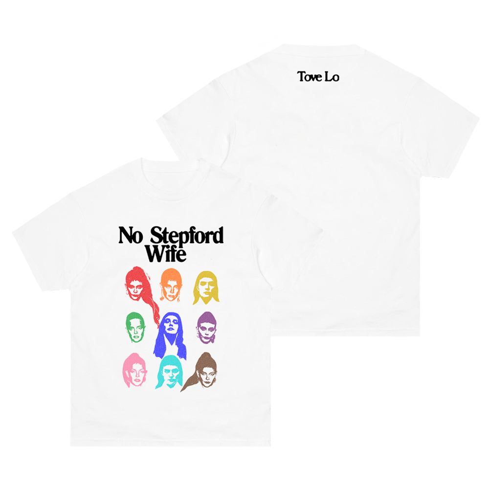 White cotton t-shirt with ""No Stepford Wife"" front print and small Tove Lo logo back print