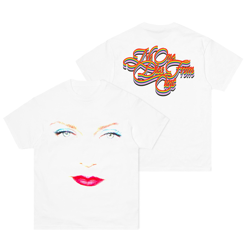 White cotton t-shirt with Tove Lo face front print and "No One Dies From Cunt" back print